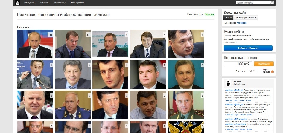 ДалСлово – общественная инициатива по контролю за обещаниями и инициативами политиков и публичных деятелей. Ресурс накапливает актуальную базу обещаний, а затем пользователи оценивают, насколько искренними и дальновидными были те, кто их давал.