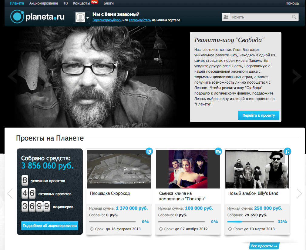 «Planeta.ru» — это новая форма отношений между авторами и их аудиторией. Площадка, которая позволяет участвовать в создании музыки, фильмов, книг, изобретений или других интересных, гениальных, важных проектов, которым способен помочь сервис коллективного финансирования.