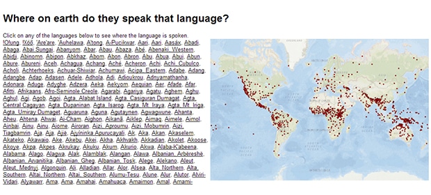 Verbix — это организация, занимающаяся распространением знания о языках и защитой существующего лингвистического разнообразия. На сайте организации есть раздел Where on Earth .., с помощью которого можно посмотреть на карте Google Maps, где говорят на любом из сотни известных языков.