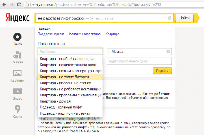 С запуском сервиса «Острова» заявление о проблемах ЖКХ стало возможно отправить напрямую через «Яндекс». Если в поисковике набрать запрос с описанием проблемы и словом РосЖКХ, то в окне выдачи результатов сразу появится форма заявления. Сейчас функция доступна только в бета-версии.