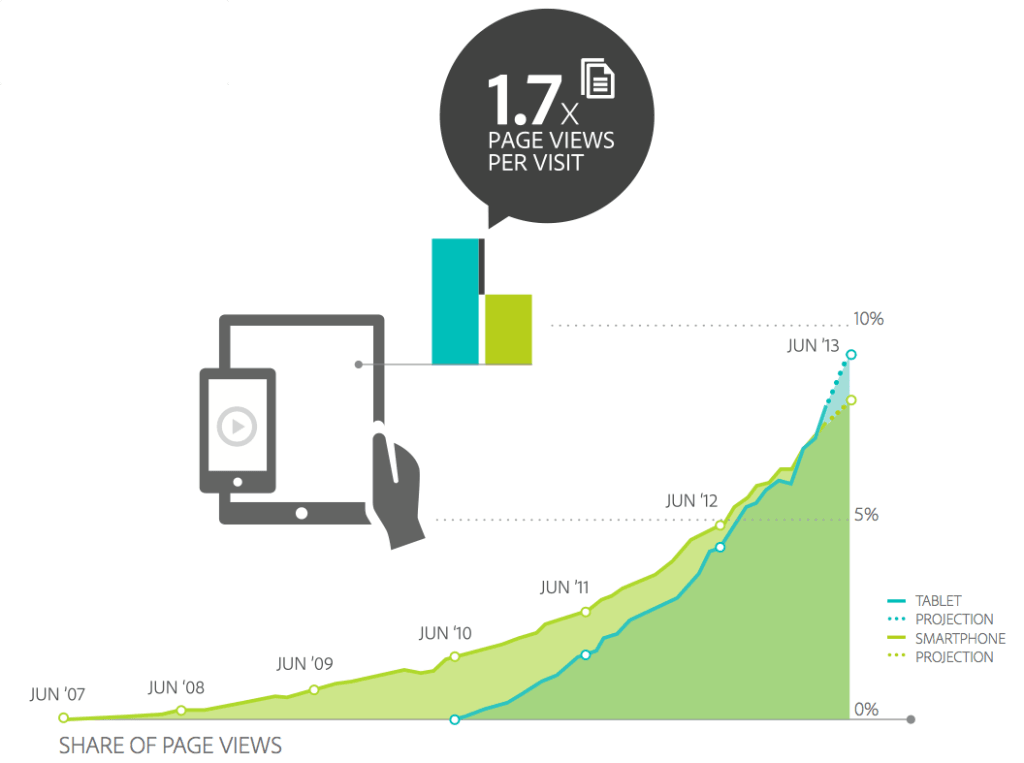 Планшеты являются скорее замещением компьютеров, чем других мобильных устройств. Так, когда люди заходят в Интернет с помощью планшета, они посещают на 70% больше сайтов, чем когда они заходят со смартфона. В результате, несмотря на то, что в мире в настоящий момент намного больше смартфонов, чем планшетов, больше трафика приходится на планшеты.