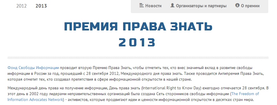 Фонд Свободы Информации проводит вторую Премию Права Знать, чтобы отметить тех, кто внес значимый вклад в развитие свободы информации в России за год, прошедший с 28 сентября 2012, Международного дня права знать. Также проводится Антипремия Права Знать, которая отметит тех, кто создавал препятствия в сфере информационной открытости в нашей стране.