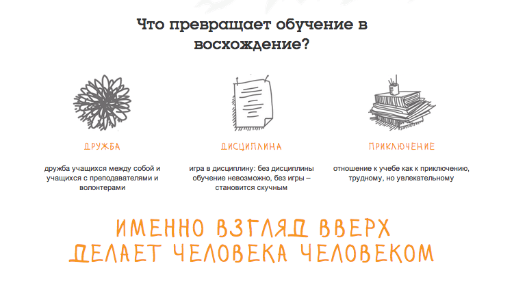 Основным отличием стало преобразование внутренних разделов сайта – были выделены, систематизированы и визуализированы основные ценности и подходы организации (которые раньше просто констатировались в тексте раздела «О нас»).