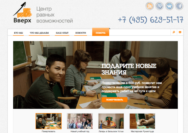 В рамках программы малых грантов для некоммерческих организаций директор по разработке Теплицы социальных технологий Анна Ладошкина разработала новую версию сайта, ориентированную на взаимодействие с частными жертвователями, ежедневную презентацию работы Центра «Вверх».