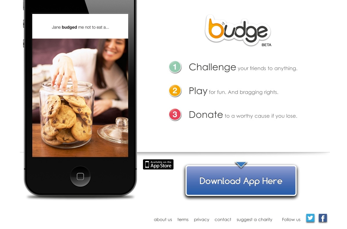 Создатели приложения «Budge» предлагают пользователям еще один способ сделать пожертвование в процессе развлечения. Заключая пари на неограниченные суммы, участники обязуются в случае проигрыша перечислить всю сумму на счет благотворительной организации. Программа приспособлена для любых споров: кто быстрее перебежит пляж, заваленный загорающими телами, или кто дольше продержится без курения – пари можно заключать прямо на месте и на любых основаниях.