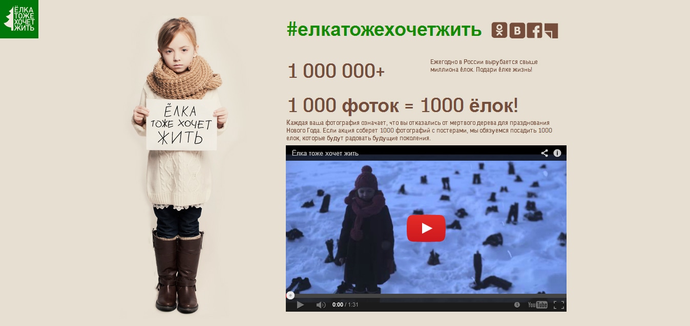 Каждая фотография с плакатом «Ёлка тоже хочет жить» означает, что вы отказались от мертвого дерева для празднования Нового Года. Организаторы обещают, что если акция соберет 1000 фотографий с постерами, они обязуются посадить 1000 ёлок, которые будут радовать будущие поколения.