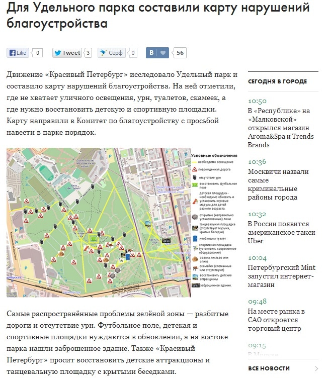 Новости из культурной столицы: онлайн-проект «Красивый Петербург» совершил еще один «озеленительный» рейд. На этот раз участники проекта исследовали Удельный парк и нашли в нем массу нарушений и проблем. Отсутствие урн, туалетов, скамеек, заброшенные здания, разбитые детские площадки – ничто не осталось без внимания активистов. Все объекты попали на карту нарушений благоустройства, которая была направлена в ведомственный комитет с просьбой обустроит парк.