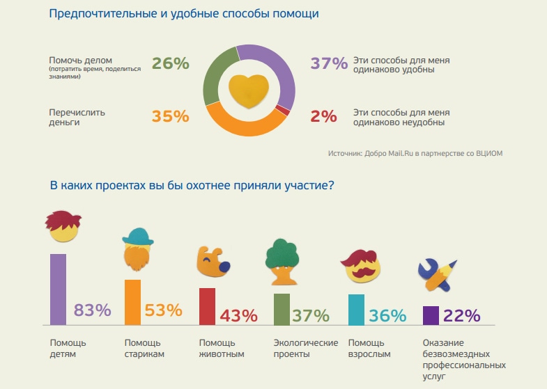 Добро Mail.Ru и ВЦИОМ провели исследование «Отношение к благотворительности в России», в ходе которого были изучены различные аспекты отношения к благотворительности и волонтёрству среди жителей России.