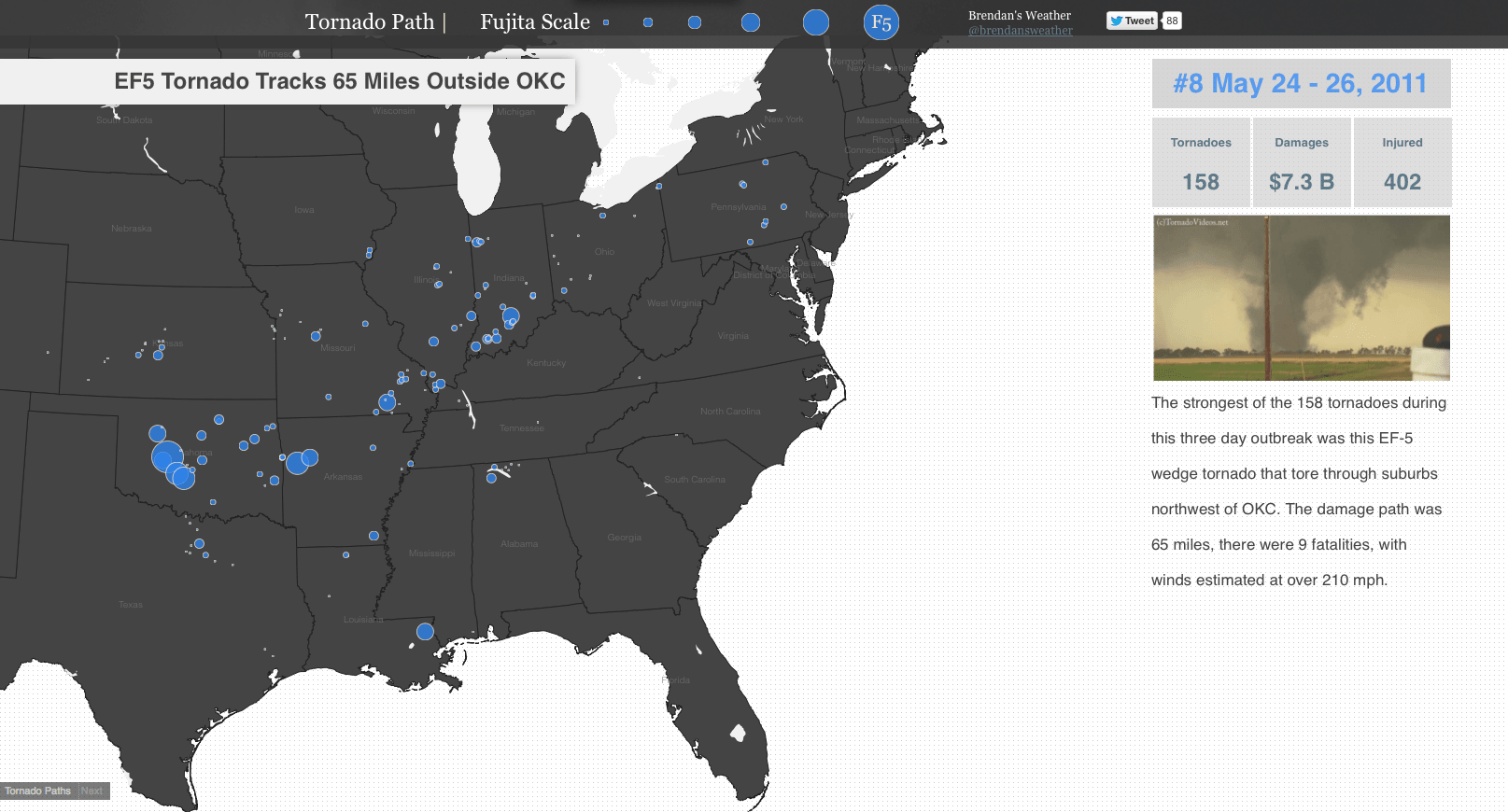 D3 работает с данными — любыми, которые вы найдете в Сети, и управляет ими уже известными пользователю способами — SVG, HTML и CSS. Однако как и любое стоящее дело, работа c D3 подразумевает определенные трудности, но если вы все же выучите язык программы, то возможности ваши будут практически безграничны. В качестве доказательства потенциала программы можно привести карту самых мощных ураганах в истории США, созданную Брэнденом Хэбертоном.