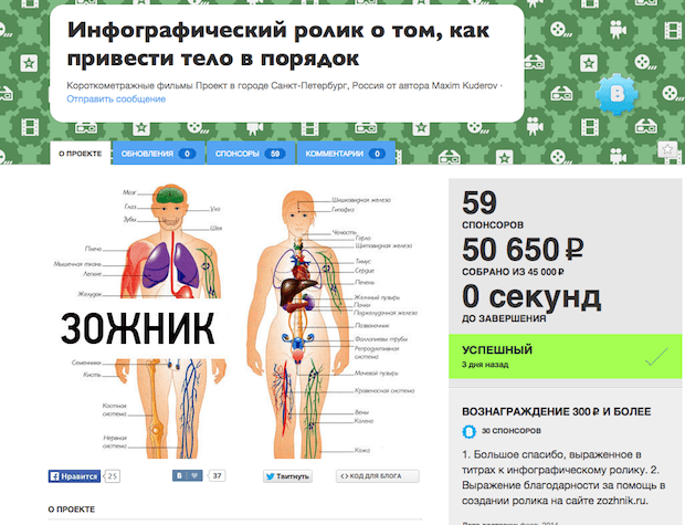 − Плюсы очевидны − возможность собрать деньги на проект и реализовать то, на что вряд ли кто-то даст денег. Возможность реализовать проекты, которые нужны людям, получить от них обратную связь рублем. «Зожник» − это наш благотворительный проект для людей, чтобы затащить в здоровый образ жизни максимальное количество людей. И мультфильм, на который мы собрали деньги, − обратная связь.