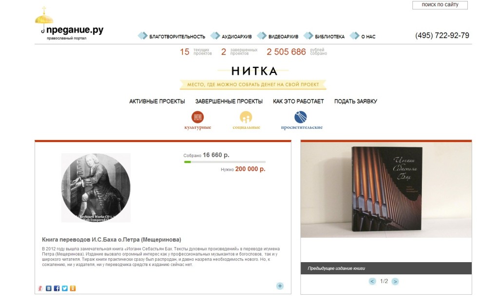 Краудфандинговая платформа «Нитка» осуществляет сбор средства на повторное издание книги с текстами сочинений композитора Баха. Первое издание вызвало большой интерес у музыкантов, богословов и простых читателей, но для повторной публикации издателям необходима финансовая помощь пользователей.