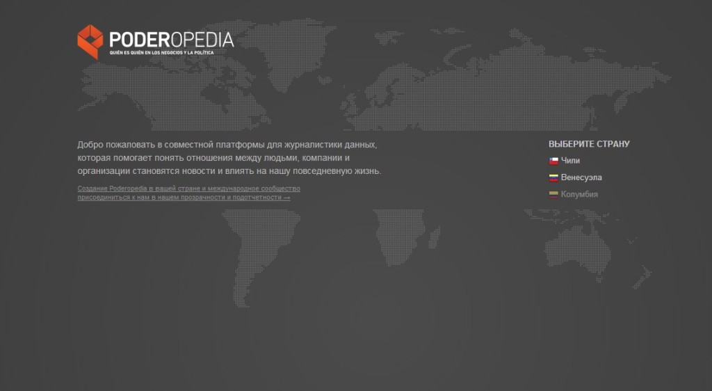Информационная платформа «Poderopedia» помогает гражданам Чили, Колумбии и Венесуэлы понять, кто есть кто на политической арене Латинской Америки. Ресурс предоставляет информацию о чиновниках и крупных организациях, преступных схемах, возникающих на различных уровнях власти, позволяющих лоббировать сторонние интересы и неправомерно использовать бюджетные средства.