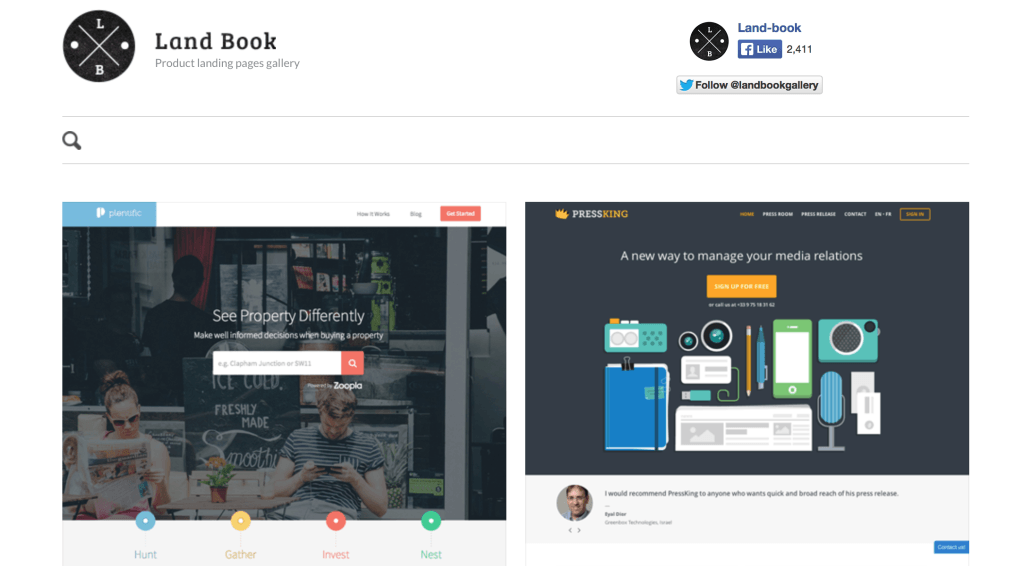 Land Book — это галерея лучших главных страниц сайтов, собранная со всего Интернета. Созданный в 2012 году польский проект быстро стал достаточно популярным, а его коллекция превышает 200 сайтов.