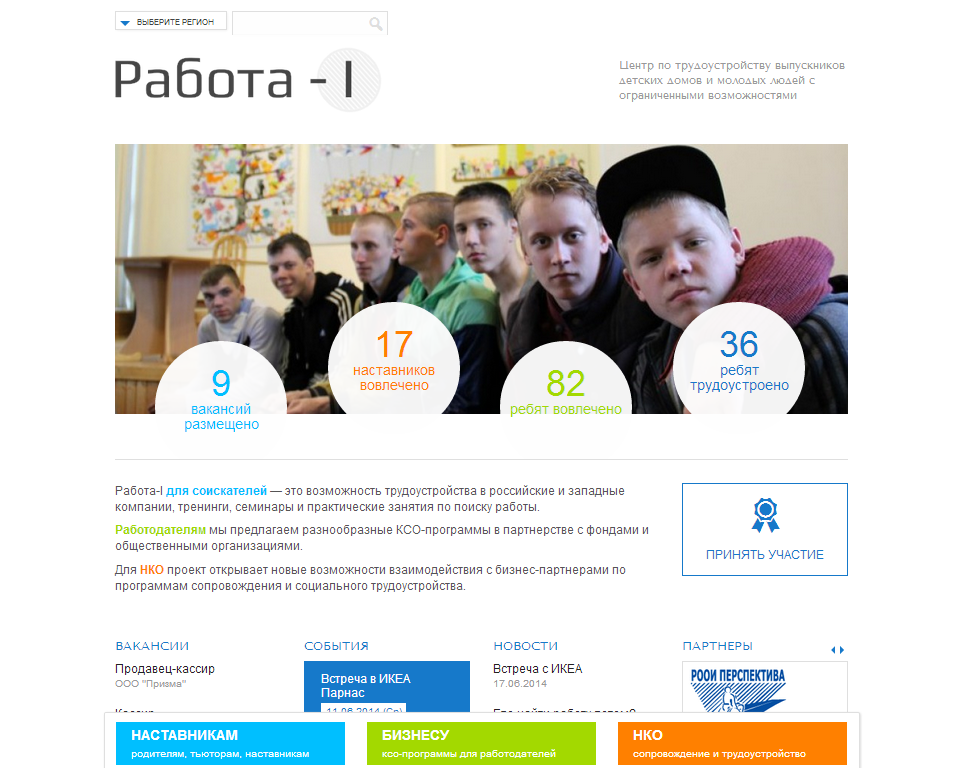 Центр «Работа-I» по трудоустройству выпускников детских домов и молодых людей с ограниченными возможностями.