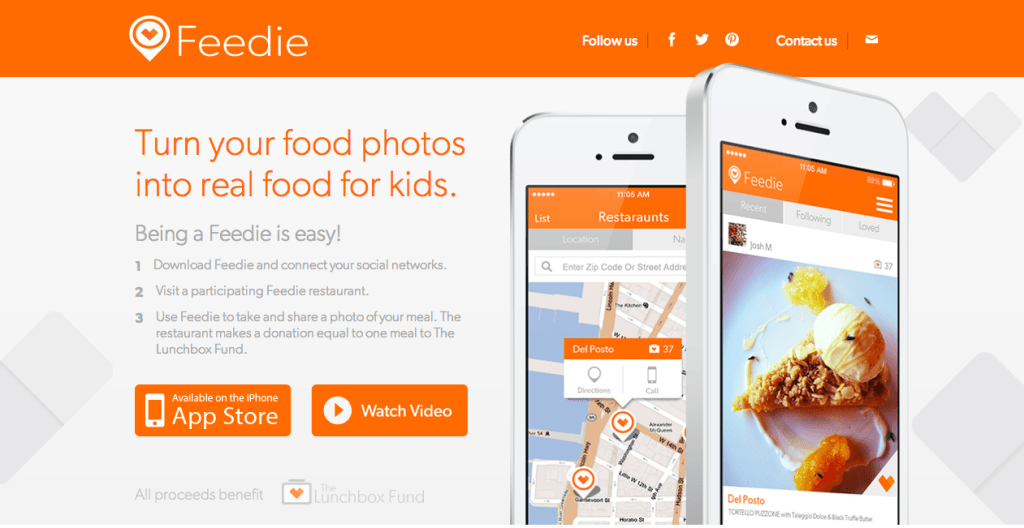 Приложение Feedie превращает любовь к фотографированию еды в благотворительную кампанию. Любой пользователь может сфотографировать еду в ресторанах-участниках кампании, при этом сам ресторан пожертвует 25 центов в некоммерческую организацию The Lunchbox Fund, которая обеспечивает обедами студентов в бедных районах Южной Африки.