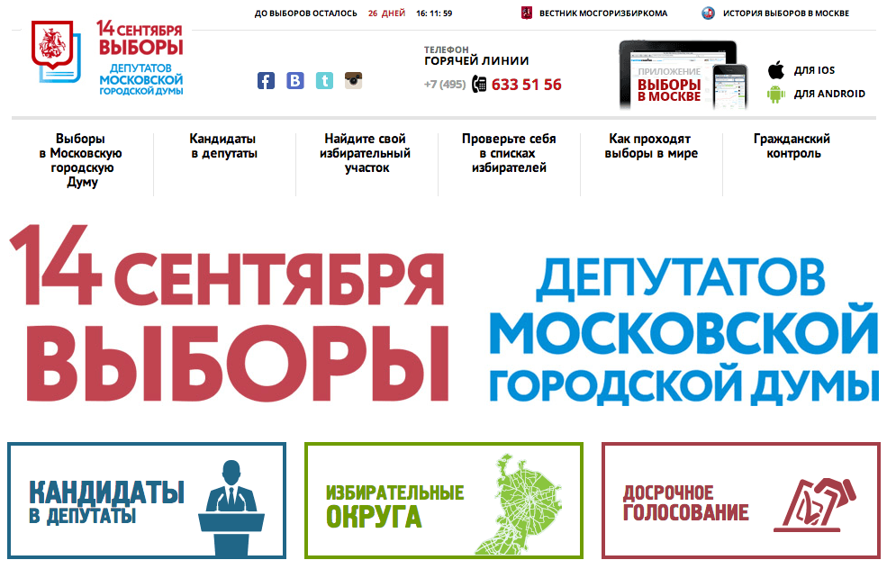 14 сентября пройдут выборы депутатов в Московскую городскую думу. С помощью информационного портала Мосгоризбиркома можно получить всю информацию о кандидатах, избирательных округах, досрочном голосовании, а также проверить себя в списке избирателей, стать наблюдателем или скачать мобильное приложение, с помощью которого можно найти свое место голосования.