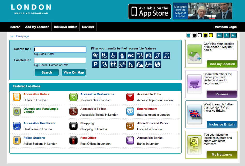 С помощью сервиса Inclusive London можно найти места в Лондоне (Великобритания), которые доступны разным категориям людей с ограниченными возможностями по здоровью, а также добавить новое место самостоятельно.