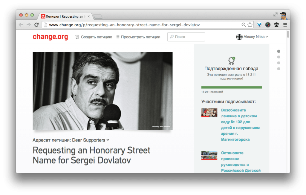 В Нью-Йорке состоялось официальное открытие указателя Sergei Dovlatov Way в районе Форест-Хиллс. Это стало возможным благодаря 18 тысячам подписей петиции на Change.org.