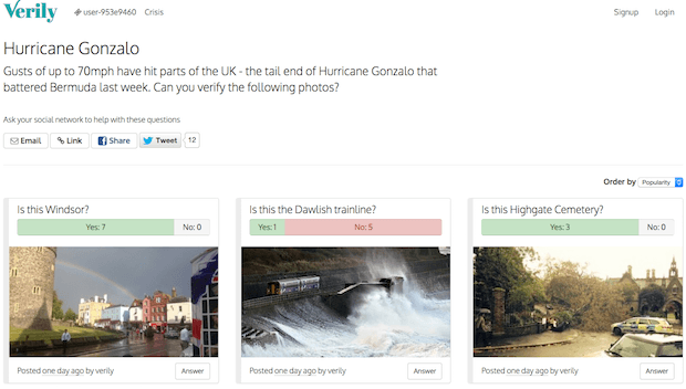 Онлайн-платформа Verily позволяет с помощью краудсорсинга совершать быструю проверку информации во время различных катастроф, чрезвычайных ситуаций или природных катаклизмов. Также сервис позволяет использовать знания участников для определения объектов на фотографиях.