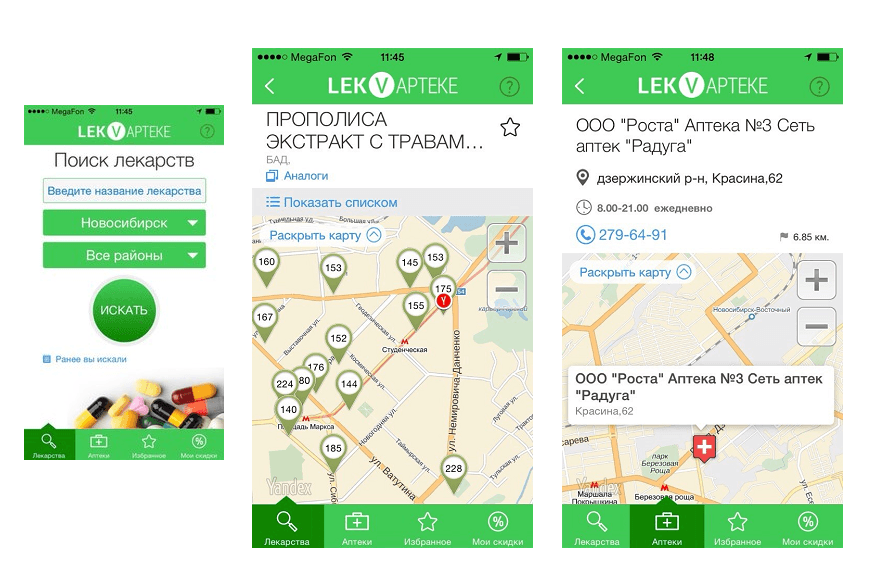 Бесплатное мобильное приложение «Поиск лекарств» представляет собой фармацевтическую карту города Новосибирска, на которой после указания нужных параметров появляются метки.