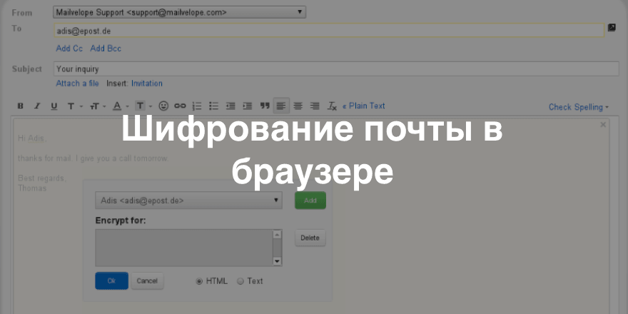 С помощью Mailvelope – расширения для браузеров Chrome и Firefox – можно шифровать электронную почту в вашем браузере, используя стандарт OpenPGP.
