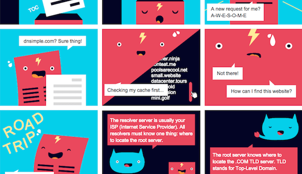 Проект How DNS works в формате комикса на английском языке объясняет, что происходит, когда пользователь набирает адрес сайта в браузере.