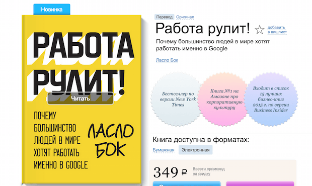Талантливые программисты, дизайнеры, менеджеры со всего мира мечтают работать в Google. Почему так происходит? На этот вопрос отвечает вице-президент Google по персоналу Ласло Бок. В своей книге «Работа рулит!» Бок рассказывает о корпоративных особенностях и системах мотивации сотрудников, распространенных в Google.