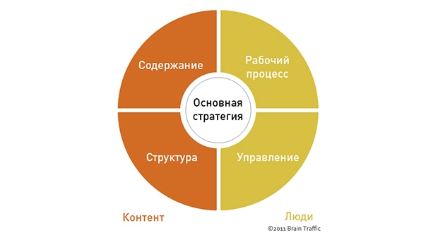 Контент-стратегия может быть разделена на 4 основных компонента, согласно Brain Traffic: