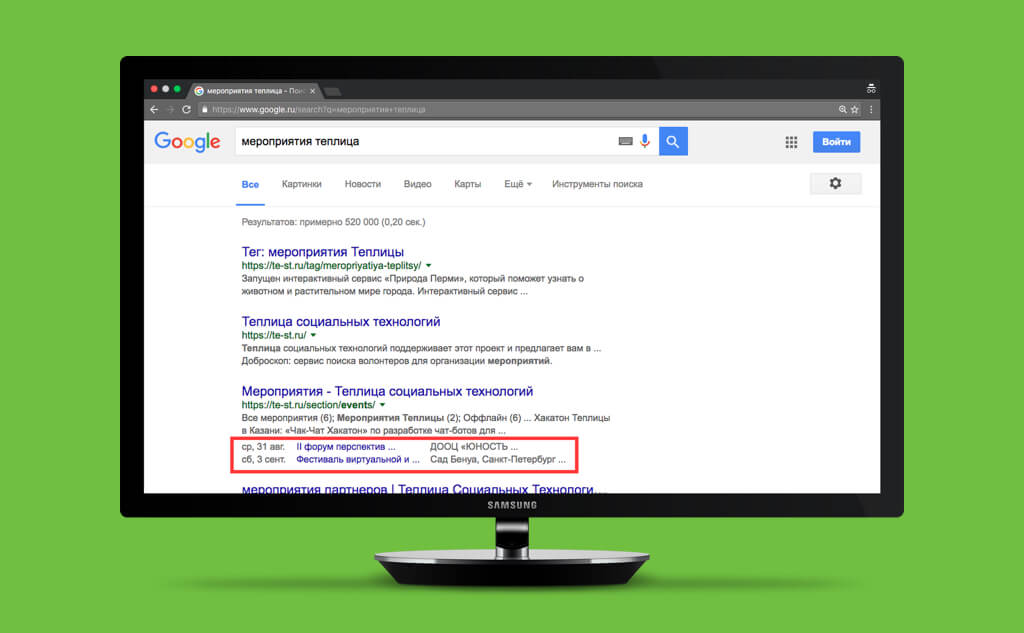 Например, такое описание о мероприятии может привлечь больше людей. Время, место и название мероприятия будет отображаться непосредственно в поисковых результатах.