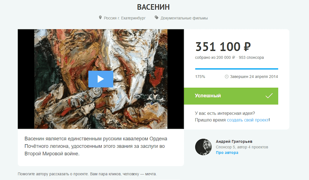 Эксперт привела в пример краудфандинговую кампанию документального фильма о ветеране Второй Мировой войны Николае Васенине, уроженце Вятской губернии. Кампанию в 2014 году запустил режиссер из Екатеринбурга Андрей Григорьев.