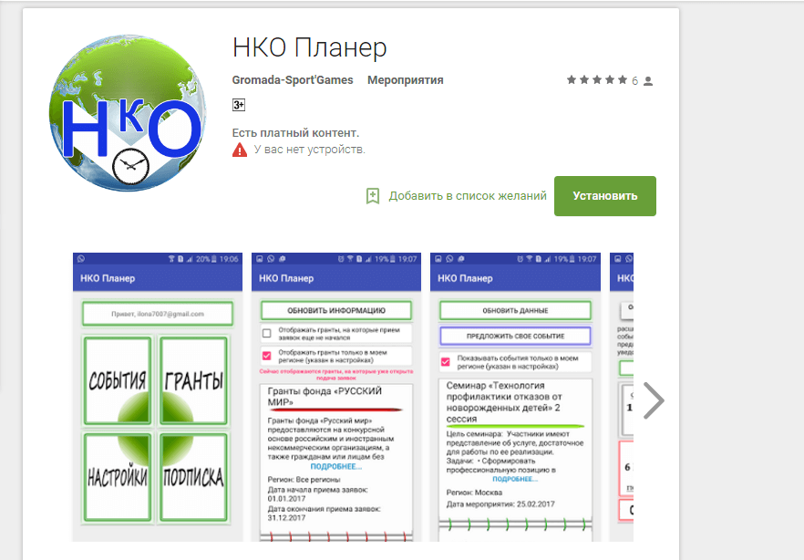 - Мобильное приложение «НКО Планер» помогает представителям российских общественных организаций следить за предстоящими конкурсами, грантами или образовательными встречами. С помощью приложения можно зарегистрироваться на мероприятия, получать уведомления и включать свое событие в базу данных.В главном окне приложения всего четыре кнопки: «гранты», «события», «подписка», «настройки». В «настройках» можно выбрать свой регион и получать информацию только из своего города. У приложения есть платная подписка с дополнительными услугами.К примеру, во вкладке «события» вы можете узнать о мероприятиях, которые проходят в разных городах России. У подписчиков плюсов гораздо больше: доступна вся информация на несколько месяцев вперед, можно зарегистрироваться на событие прямо из приложения. А еще есть возможность сообщить о своем мероприятии (сделать заявку, чтобы его включили в базу «НКО Планер»).