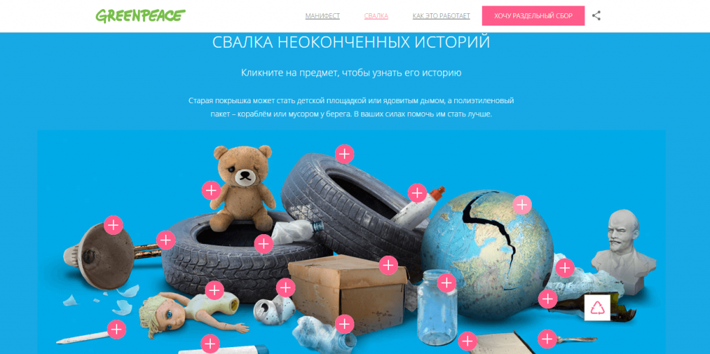 Кампании Гринпис про раздельный сбор мусора построены на удивлении аудитории: тема подается позитивно, ярко, создается образ прогрессивного человека. В 2014 году лицом кампании «Миллион за раздельный мусор» стал фронтмен группы Therr Maitz Антон Беляев.
