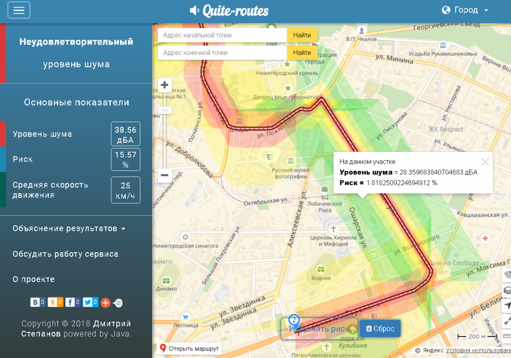Сервис онлайн-мониторинга шума от транспортных потоков Quite-routes работает аналогично сервису Eco-routes. Рассчитывает уровень шума в границах территории вдоль однородного линейного источника шума – дороги. На основе этих данных можно просчитать риски для здоровья людей, которые оказались в этой зоне, и предложить шумозащитные мероприятия.