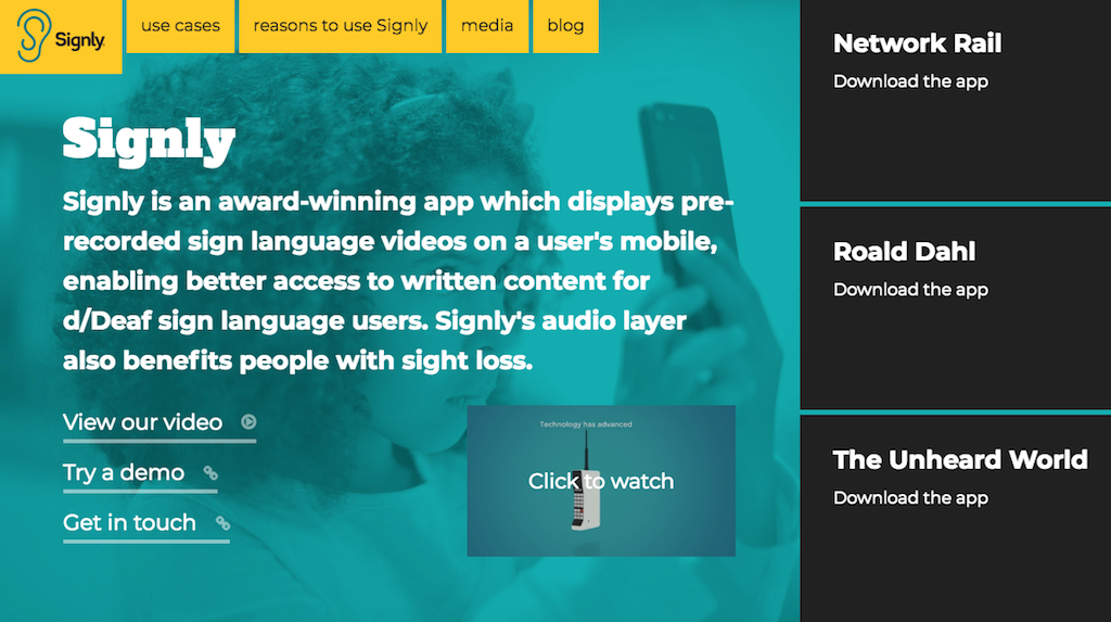 Signly – приложение для людей с ограничениями по слуху и общающихся на языке жестов, которое дает возможность просмотреть тексты, которые были ранее переведены и записаны на языке жестов.