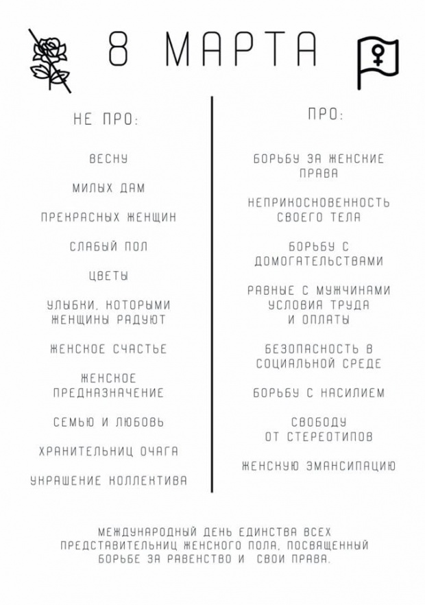 «Альянс гетеросексуалов и ЛГБТ за равноправие» сравнил, какой смысл вкладывали в 8 Марта основательницы, и какой вкладывают нынешние представительницы женского движения.