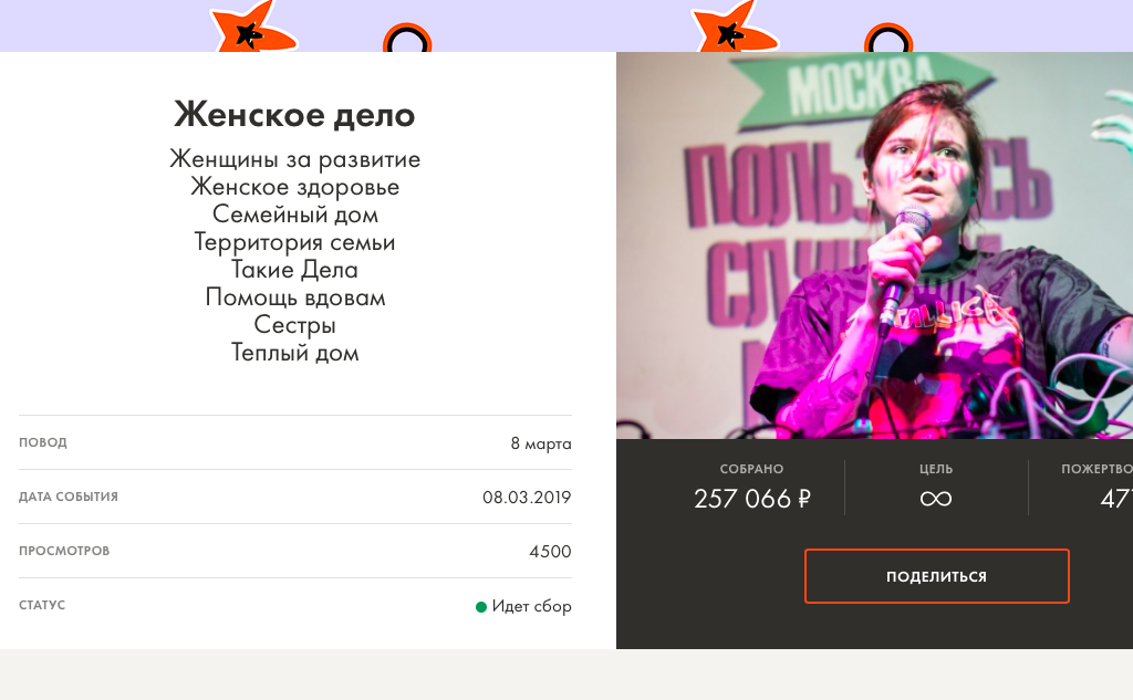Фонд «Нужна помощь» запустил акцию «Женское дело», чтобы поддержать шесть проектов, которые помогают женщинам, оказавшимся в тяжелых жизненных ситуациях. К акции еще можно присоединиться. Для этого нужно создать свой сбор или сделать пожертвование в один из созданных.