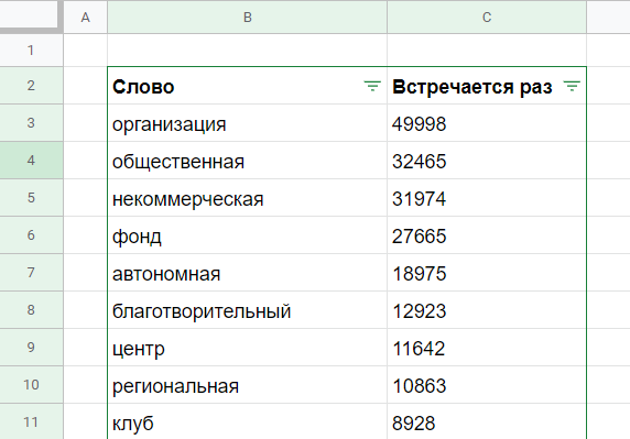 Мы составили таблицу, состоящую из слов и их частотности. В левой колонке само слово, которое встречается в названиях благотворительных организаций, а справа число, обозначающее сколько раз это слово встретилось.