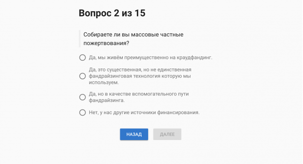 Создатели предлагают пройти два теста: по ведению финансовой политики и по взаимодействию с контролирующими органами. Вопросы посвящены таким темам как способы сбора пожертвований, финансовая и содержательная отчетность, административные затраты, аудит.