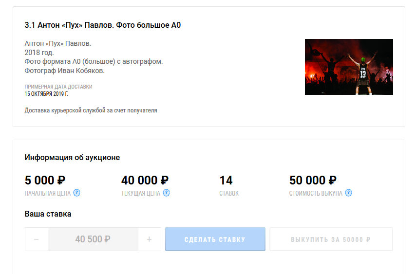 Эти цифры необходимы при размещении аукционного лота. Мы установили в качестве начальной стоимости каждой большой фотографии с автографом музыканта 5000 рублей, в качестве шага – 500 рублей, а цену выкупа сделали достаточно высокой, чтобы было интересно именно торговаться – 50 тысяч рублей. К слову, пока ни одну фотографию не купили по цене выкупа, но торги за фото Антона Павлова, солиста F.P.G приближаются к выкупной цене: на момент публикации за лот сделано 14 ставок, самая большая из которых – 40 тысяч рублей.