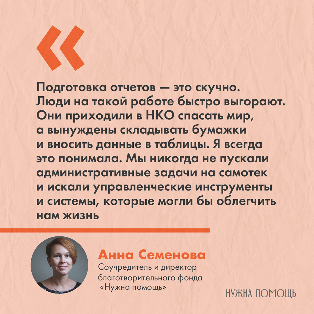 В небольшом фонде директору проще все успеть, но как только организация вырастает в объемах привлеченных денег и количестве сотрудников, без отстроенной административно-управленческой части работать становится очень сложно. Даже просто на подготовку отчетов для доноров тратится уйма времени, если этот процесс не автоматизирован.