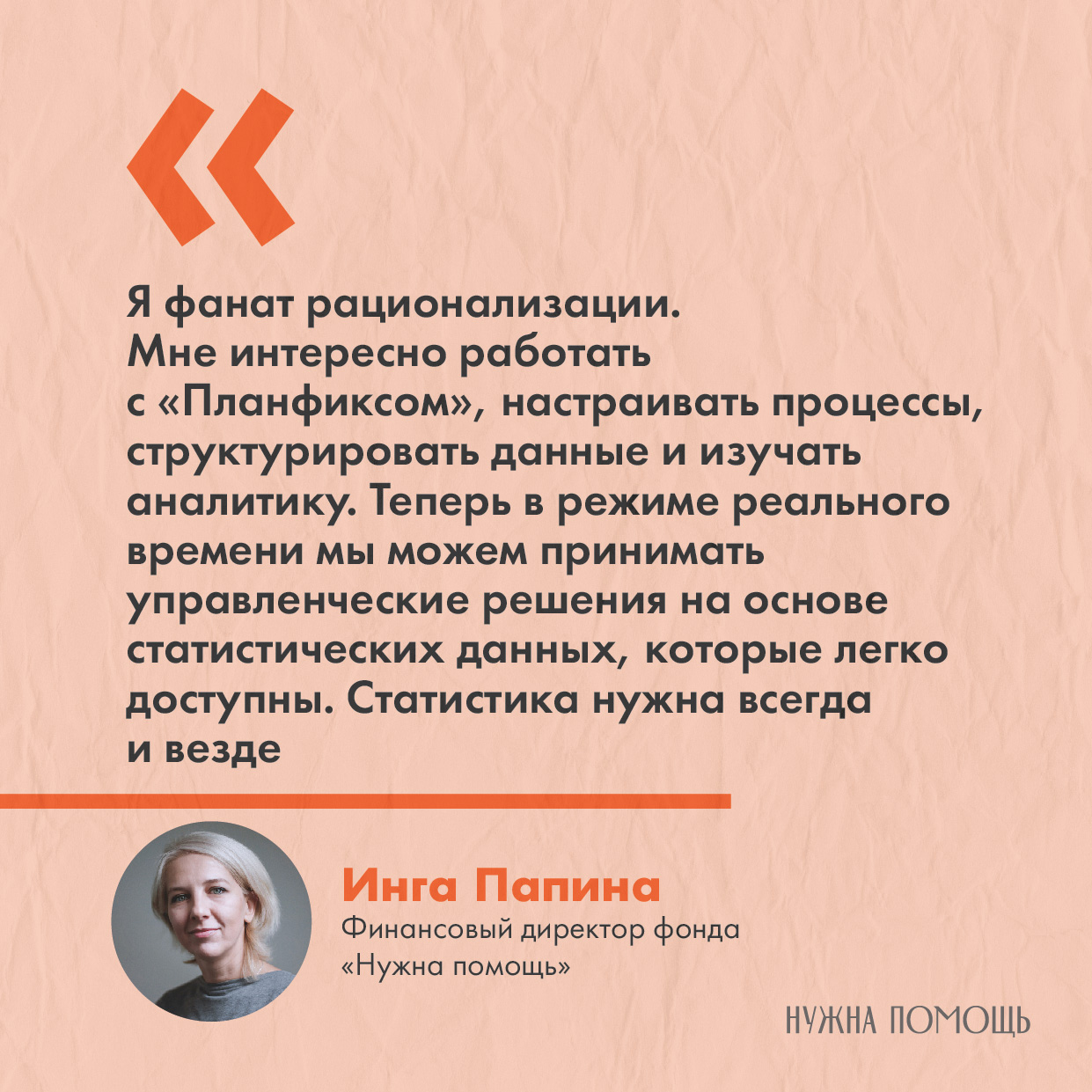 Сегодня мы поддерживаем 189 благотворительных организаций по всей стране. У фонда «Нужна помощь» есть информационный портал «Такие дела», онлайн-сервис «Пользуясь случаем», отдел исследований, издательство и другие проекты. В фонде работает 71 человек. Мы большая организация, постоянно растем и развиваемся, а также делимся знаниями и опытом использования полезных сервисов. Даже за то время, пока мы переходили на «Планфикс», мы выросли почти вдвое: это касается и штата, и проектов, и финансовых оборотов. Так что для нас грамотное финансовое планирование и управление процессами – вопрос эффективности и выживания.
