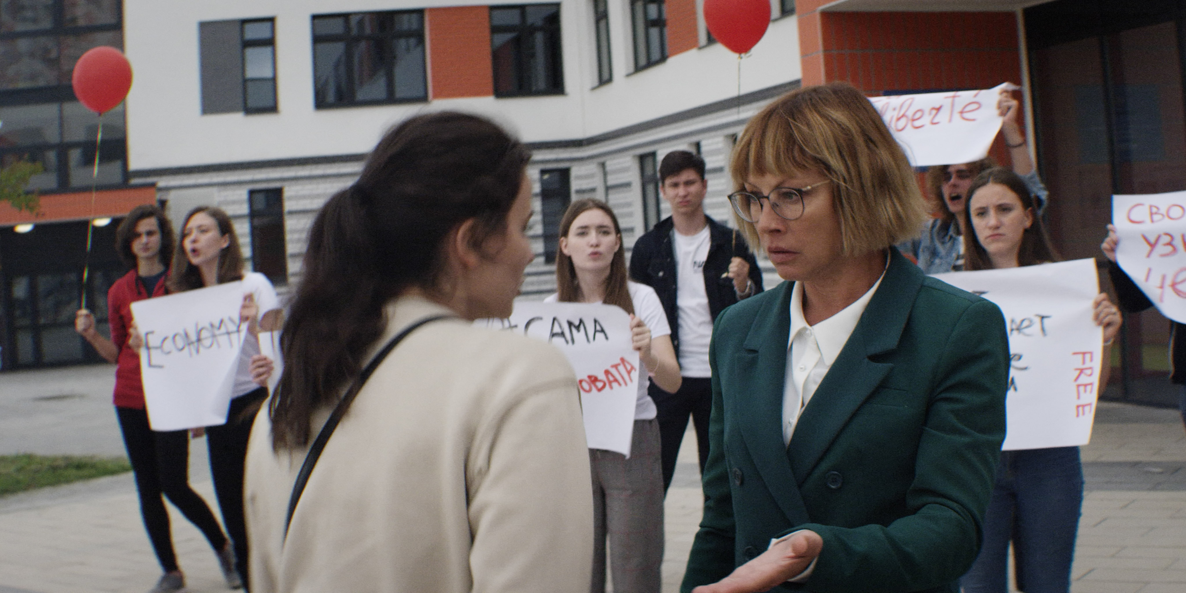 «Мы думали, а давайте в этой сцене у нас будут не просто стоять в очереди на пикет, а держать при этом плакат «ЯМы». Потом летом, в разгар московских протестов публицист и писатель Елизавета Александрова-Зорина выложила текстовую запись суда, на котором ей присудили штраф за участие в митинге. И мы поняли, что сцена суда, которая есть у нас в сценарии, гораздо слабее, чем то, что происходит в реальности. Мы попросили Лизу использовать ее историю в нашей сцене. Жизнь сама дописывала за нас фактуру». Ната Покровская