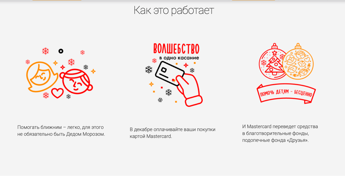 Платежная система Mastercard запустила новогоднюю благотворительную кампанию «Создадим новогоднее волшебство – вместе поможем детям». Каждый владелец карты Mastercard, который в декабре делает покупки, автоматически поддерживает акцию. По результатам кампании Mastercard направит деньги в 12 российских благотворительных фондов. Также в поддержку акции в социальных сетях был запущен флешмоб под хештегом #детскиемечты. Пользователям предлагают опубликовать фотографию, символизирующую детскую мечту, поделиться историей про нее со своими подписчиками и рассказать про кампанию Mastercard.