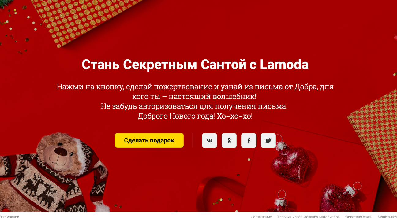К Новому году сервис «Добро Mail.ru» и онлайн-платформы Lamoda дают возможность всем желающим стать Секретным Сантой для одного из благотворительных фондов. На специальной страничке пользователи выбирают, кому они хотят перевести деньги: детям, взрослым, старикам или животным. И указывают размер пожертвования. О том, в какой из 187 фондов были направлены средства, можно будет узнать уже под Новый год. Каждый участник получит отчет о том, как подарок помог подопечным той или иной организации.