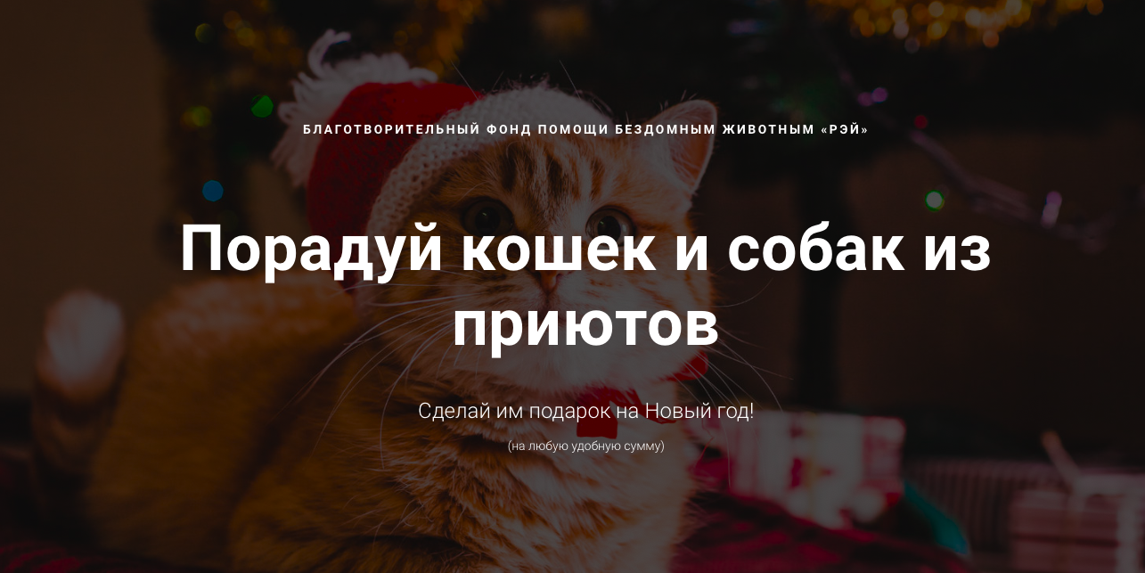 Фонд «РЭЙ», который помогает бездомным животным, к Новому году создал страницу с пожеланиями Деду Морозу от лица кошек и собак. Животные сами рассказывают в «письмах» о себе и о том, что они хотели бы получить в подарок на праздник. Пользователи могут выбрать то пожелание, которое они готовы исполнить, и сделать пожертвование в фонд на соответствующую сумму.