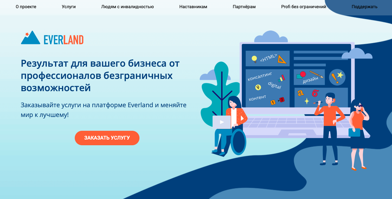 Инклюзивный проект Everland решает задачу трудоустройства людей с инвалидностью. Они получают заказы от крупных организаций в сферах дизайна, контента, веб-разработки. Клиенты платят за результат и выполненные задачи. Еще один инклюзивный проект – мастерские «Простые вещи». В мастерских взрослые люди с особенностями развития психики и интеллекта работают и занимаются творчеством.