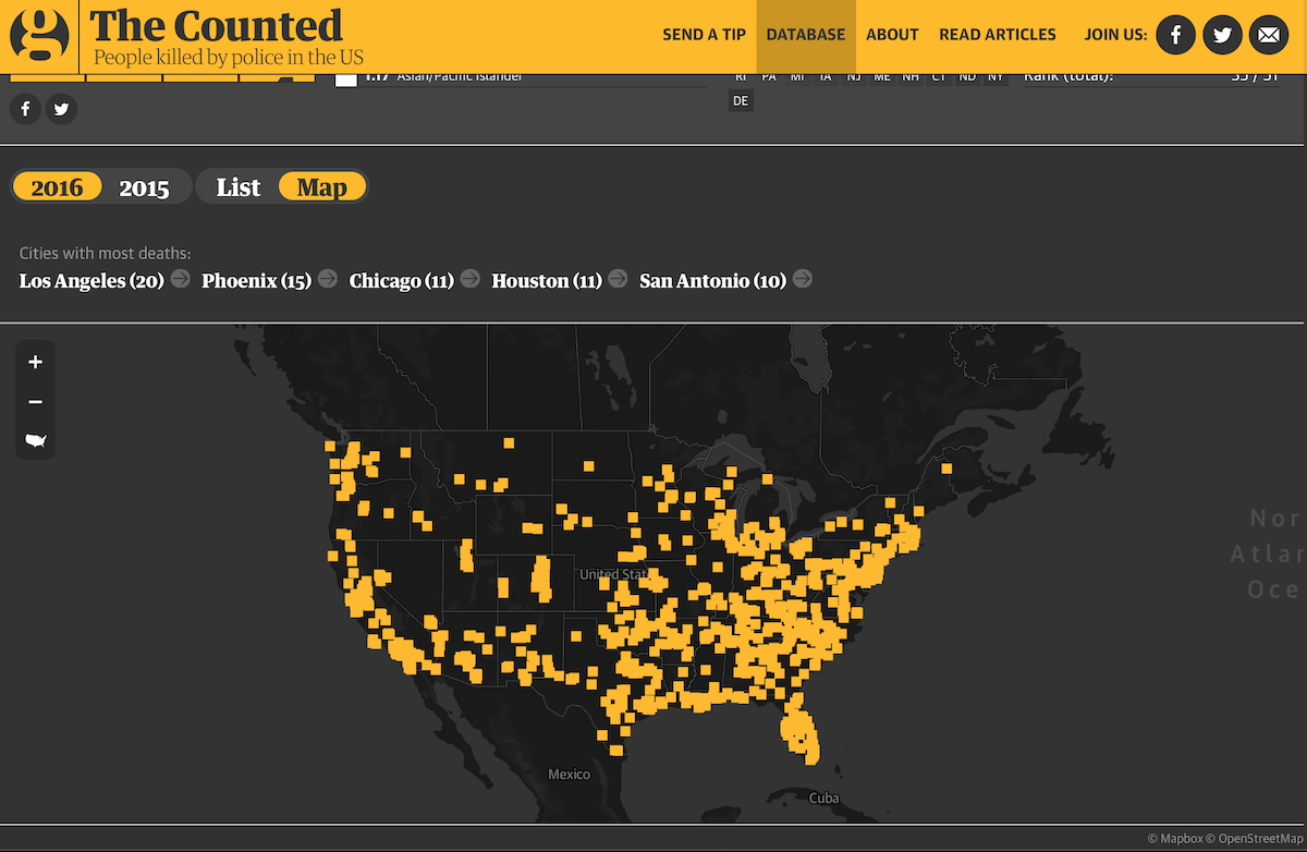 Команда The Guardian собрала свою собственную базу данных смертей, связанных с деятельностью полицейских в США в 2015 и 2016 годах. При ее составлении они мониторили местные новости, звонили в морги, организовали форму, через которую все желающие могли отправлять им подсказки. Они также обращались к таким уже существовавшим краудсорс-инициативам по сбору данных о полицейском насилии, как проекты Killed by the Police и Fatal Encounters. Вокруг The Counted образовалось целое сообщество людей, небезразличных к теме полицейского насилия. Как итог, журналистам удалось собрать базу данных, рассказать множество историй погибших людей и написать ряд статей о проблемах полицейского насилия и американской статистики по этому вопросу.