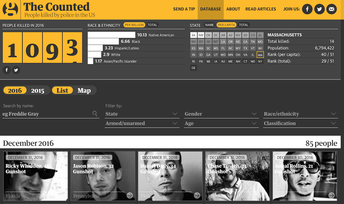 Более того, им удалось системно повлиять на сбор статистики по этому вопросу. В то время директор Федерального бюро расследования Джеймс Коми сказал, что это «недопустимо» и «постыдно», что статистика журналистского проекта оказывается лучше, чем государственная, за которую в том числе он несет ответственность. Статистическое управление юстиции США выпустило отчет, согласно которому существующая система регистрации полицейского насилия не учитывала примерно 54% смертей. В результате ФБР сейчас руководит программой национального масштаба, пытаясь понять, как представители правоохранительных органов обращаются к насилию при исполнении.