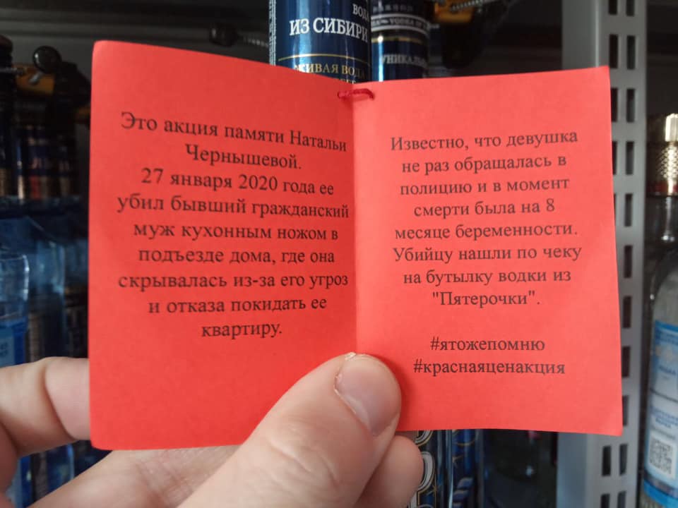 Активисты также придумали превратить мини-открытки, которыми обычно украшают коллекционный алкоголь, в мини-манифесты о смерти вследствие домашнего насилия. Всем желающим предлагали скачать макет открытки, написать на ней историю, связанную с домашним насилием, а затем разместить ее в алкогольном отделе любого магазина.