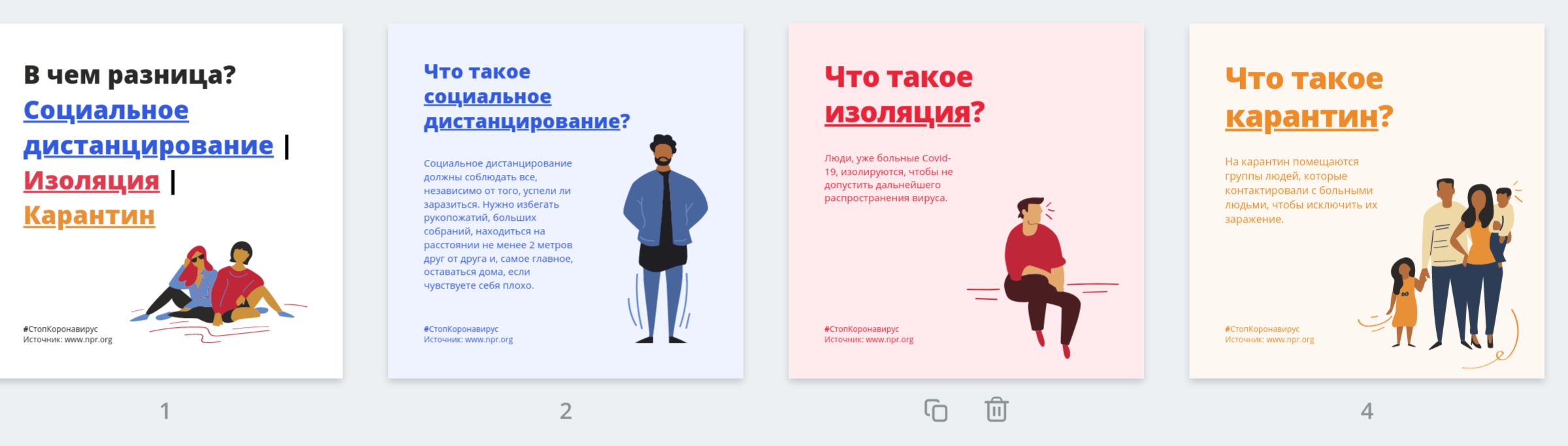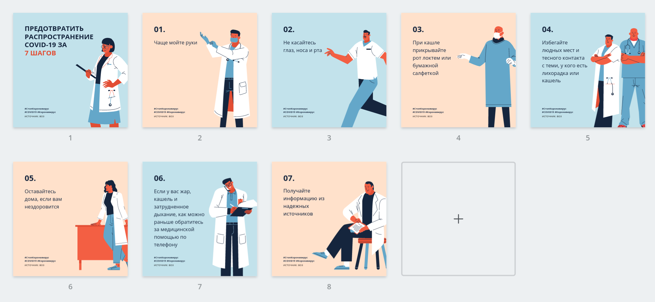 Шаблоны переведены на русский язык и доступны для просмотра в каталоге Canva после бесплатной регистрации. Это шаблоны для публикаций и историй в социальных сетях, а также плакатов и флаеров, которые можно использовать в качестве печатных макетов. Все шаблоны основаны на рекомендациях и информации Всемирной Организации Здравоохранения. Примеры русскоязычных шаблонов можно найти в этой папке.